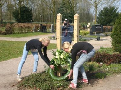 Toen de klanken van het Volkslied verstomd waren legden, Ilse, Iris, Maud en Pleun, leerlingen van groep 8 een krans bij het monument. Een gedenkteken dat niet alleen naar de oorlogsjaren 1940-1945 verwijst maar ook naar het feit dat wij al 70 jaar in vrijheid mogen leven. Een monument dat voor de inwoners van Okkenbroek een blijvende herinnering is aan de mensen die tijdens en na de Tweede Wereldoorlog zijn omgekomen. Als de herinnering levend blijft, leeft ook het besef dat vrede kwetsbaar is. Dat vrede en vrijheid niet vanzelfsprekend zijn, daar hoeven we de kranten maar voor open te slaan of de tv voor aan te zetten.