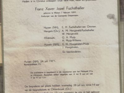 Fuchsthaller, inmiddels overgrootvader, die net als zijn vrouw in Huizen is overleden ligt samen met haar begraven op het kerkhof in Okkenbroek. De bloemen bij de begrafenis van Fuchsthaller op 28 juli 1971 hadden in hoofdzaak de kleuren rood en wit. De kleuren van Oostenrijk. De rouwstoet vanaf Ons Centrum waarbij vroegere buren als dragers fungeerden, week even van de weg af om langs de voorkant van de “Villa” te trekken als een laatste groet aan het huis waar hij met de zijnen zolang gewoond heeft.
