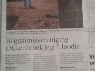 In november 2016 is er een bedrag van € 1.152,79 in kas. Het bestuur heeft in vervolg daarop besloten om de vereniging per 1 januari 2017 formeel op te heffen. Alle verplichtingen tot die datum worden normaal uitgevoerd. Het saldo dat overblijft wordt geschonken aan de onlangs in het leven geroepen Vereniging Begraafplaats Okkenbroek. De samenwerking met uitvaartverzekering Twenthe N.V. te Enschede zal worden opgezegd. De polissen die daar zijn afgesloten lopen gewoon door. Voor een uitvaart in Okkenbroek kan de heer H. Stoevenbelt eventueel zorgen voor dragers.
