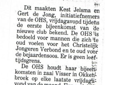 In café Visser volgde op 15 januari 1993 de oprichtingsvergadering. De OHS staat open voor alle ‘heren’ die zich te oud vinden voor het C.J.V. en te jong voor de Seniorensoos. Het vast ontmoetingscentrum is café Visser. Die zelfde avond werden afspraken gemaakt voor het aantal activiteiten en de aard daarvan. Een kleine dertig heren waren bij de startbijeenkomst in café Visser aanwezig. Men kon voor vijf gulden per jaar 'heer' worden door een bijdrage te geven aan de OHS zodat de kosten gedekt waren. De leeftijdsgrens van 50 haalde het niet waardoor Gert de Jong (63) nog steeds lid is. Erelid zelfs. Op de tweede bijeenkomst op 26 februari werd een film over Oud Okkenbroek getoond. Zou deze film nog ergens zijn?
