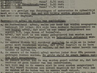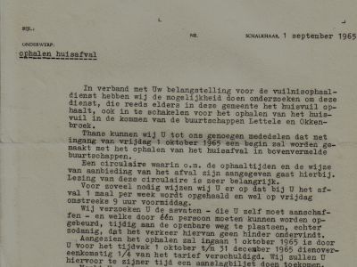 Ongeveer een half jaar later (1 september 1965) ontvangen Okkenbroeks Belang en alle deelnemers aan de huisvuilophaaldienst een brief van de gemeente Diepenveen. Daarin wordt aangegeven dat één maand later zal worden begonnen met het ophalen van het huisvuil in de kom van Okkenbroek. Een circulaire met tarieven en ophaaltijden (afvalwijzer) is bijgesloten. Op vrijdagen, vanaf 09:00 uur, wordt naar volle tevredenheid, het afval opgehaald.