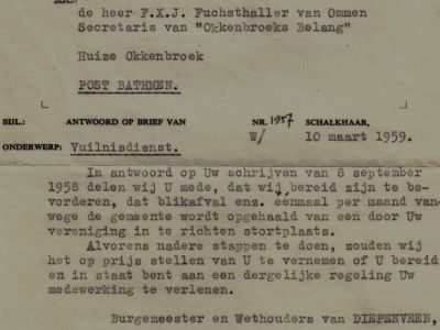In maart 1959 laat de gemeente Diepenveen, in reactie op een brief van Okkenbroeks Belang van september 1958, weten een voorzichtige start met het ophalen van blikafval in buurtschap Okkenbroek te willen maken. Eenmaal per maand zal dit afval door de gemeente worden opgehaald op een door Okkenbroeks Belang in te richten stortplaats. De archieven geven geen uitsluitsel of deze stortplaats er ook echt is gekomen, laat staan waar dit dan is geweest. Noch is er iets te vinden over een schillenboer. Mogelijk heeft dat te maken dat het groente-, tuin- en fruitafval aan de beesten werd gevoerd. Dit afval, wist men toen al, was niet nutteloos en heel goed eten voor de beesten. Zo hield men de kringloop in stand. Voor de schillenboer met zijn paard en wagen, viel in Okkenbroek geen eer te behalen.