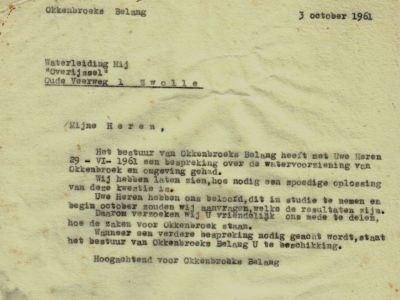 Het heeft nogal wat voeten in aarde gehad voor men er van kon profiteren. Aan de andere kant: het oorspronkelijke genoemde jaartal van 1966 daarop heeft Okkenbroek niet hoeven te wachten.Tijdens het huisbezoek van burgemeester Crommelin in februari 1958 maakte Okkenbroeks Belang (OB) dankbaar gebruik de al jaren slepende kwestie van het ontbreken van een watervoorziening onder de aandacht te brengen. Het bestuur van OB besluit na tijden van stilte in het dossier ‘waterleiding’ op 4 april 1961 een brief aan de Overijsselse Waterleiding Mij (WLM) te sturen met de uitnodiging in Okkenbroek te komen praten over de waterverzorging in Okkenbroek en omgeving. Als een reactie uitblijft volgt op 7 juni van dat jaar een herinneringsbrief. De aanhouder wint. Nog geen week later krijg secretaris Fuchsthaller een schrijven van de Waterleiding Mij ´Overijssel´ N.V.. Zij stellen een aantal dagen voor om ´telkens des avonds om 07.30 uur´ een bespreking te houden over de watervoorziening van Okkenbroek. Na telefonisch (!) overleg kan de bijeenkomst donderdagavond 29 juni op ´Huize Okkenbroek´ worden gehouden. Namens de WLM zijn aanwezig de heren W. Akkerman en Koopman. Voor OB is het voltallige bestuur van de partij.