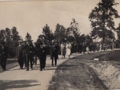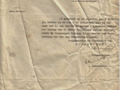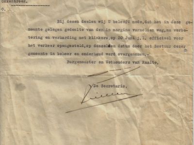 “Bij dezen deelen wij U beleefd mede, dat het in deze gemeente (Raalte) gelegen gedeelte van den in margine vermelden weg, na verbetering en verharding met klinkers; op 20 juni j.l. officieel voor het verkeer opengesteld, op denzelfden datum door het Bestuur deze gemeente in beheer en onderhoud werd overgenomen.” Was getekend 30 juni 1936 Burgemeester en Wethouders van Raalte. De brief is gericht aan bewoner van Huize Okkenbroek, de heer G.L. de Wetstein Pfister in zijn rol als voorzitter van Plaatselijk Belang “Okkenbroek”. De weg waar het over gaat is die van Okkenbroek naar Espelo. Ruim veertien dagen later ontvangt De Wetstein Pfister als secretaris der vereniging “Gemeenschappelijk Belang van Okkenbroek en Omgeving” een brief van B&W van Diepenveen. De gemeente laat daarin weten dat ten name van J. van Santen te Heeten (gemeente Raalte) een bedrag van fl. 900,00 beschikbaar wordt gesteld als bijdrage aan dezelfde weg.