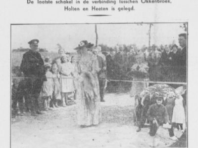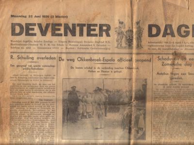 Verbouwereerd luisterden de inwoners van de buurschap Okkenbroek (gem. Diepenveen bij Deventer) naar de toespraak van hun burgemeester, de heer Ph. van der Most, bij de ingebruikneming van een nieuwe verharde weg, die tot nu toe niet veel meer dan een breed karrespoor was geweest. De burgemeester verklaarde tot zijn ontgoochelde toehoorders, dat hij niets van de weg wilde weten. “De landelijke rust is verstoord en het mooie natuurschoon is veranderd in een racebaan. Bovendien is er geen verkorting in de verbinding naar het naburige Bathmen, tot stand gekomen”, aldus de burgemeester, die het feestelijke lint niet in het midden, maar vlak naast de paal afknipte. De achtergrond van de weinig vreugdevolle woorden van de burgemeester moeten worden gezocht in het feit dat het gemeentebestuur steeds tegen wegverharding is geweest en er eerst onder druk van de raad toe moest besluiten. De schoolkinderen zongen nochtans luidkeels het Okkenbroekse volkslied."