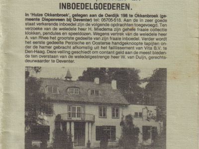 Daarna heeft de heer Fleers in Huize Okkenbroek gewoond. Hij had de villa gekocht en er weer veel in verbouwd en zo de geruchten gingen zou er een sexclub in komen. Zeker is dat in elk geval één instantie in Okkenbroek, in reactie op die geruchten, in 1979 haar zorgen kenbaar gemaakt heeft bij B & W van de Gemeente Diepenveen. Het college antwoordde met de verzekering dat het alle middelen zou aanwenden om een ongewenste ontwikkeling te bestrijden. Tot grote opluchting van de Okkenbroekers heeft er zich, om welke reden dan ook, geen bedrijf in van dat type gevestigd. Was dit het begin van het einde van de familie Fleers als bewoners van Huize Okkenbroek? Feit is dat in 1980 een hoogst belangrijke spoedveiling van kunst- antiek- en inboedelgoederen in Huize Okkenbroek plaatsvond wegens vertrek van de familie P. Fleers. De in zeer goede staat verkerende inboedel werd gehouden ten overstaan van de weldedelgestrenge heer W. van Duijn, gerechtsdeurwaarder te Deventer. Aan de veiling werden goederen toegevoegd van de heer H. Miedema, de heer A. van Rhee en handgeknoopte Perzische en Oosterse tapijten uit het faillissement van Vita B.V. uit Den Haag. De kijkdagen, voorafgaand aan de verkoop waren van 26 tot 29 september. De verkoop liep van 29 september tot 3 oktober. De goederen, zo staat in de omvangrijke catalogus die speciaal voor de veiling is gemaakt, moesten vervoerd zijn uiterlijk zaterdag 4 oktober 1980 voor 12:00 uur. Het gezin Fleers vertrok waarna Kees Bruisma de villa kocht.