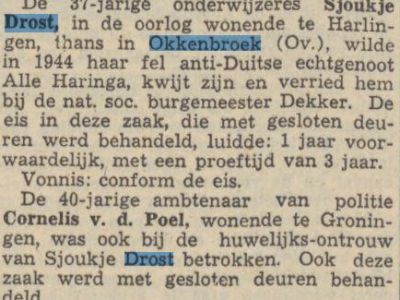 De oorlog mag dan voorbij zijn. In de Heerenveensche Courier van 1947 duikt de naam Okkenbroek op in een rechtszaak tegen onderwijzeres Sjoukje Drost. Voor zij naar Okkenbroek kwam heeft zij, aldus het bericht in de krant, getracht in 1944 van haar man af te komen door hem aan te geven als anti-Duits en pro-Engels. Een week later wordt Drost conform eis, aldus de krant, voor deze huwelijks-ontrouw veroordeeld.