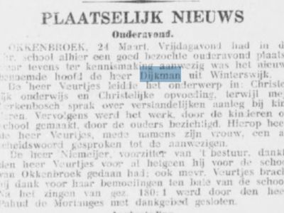 In de zes jaar dat meester Dijkman hoofd van de school in Okkenbroek was wist hij de harten van de Okkenbroekers voor zich te winnen. Het afscheid in 1936 ging zowel het echtpaar Dijkman als de inwoners van Okkenbroek niet in de koude kleren zitten. Menig Okkenbroeker pinkte een traantje weg en ook mevrouw Dijkman liet haar tranen de vrije loop. Met het oog op de studie van hun kinderen verhuisde de familie Dijkman naar Leesten bij Warnsveld omdat, zeker in die tijd, Deventer voor schoolgaande kinderen alles behalve om de hoek lag. Jaantje Nijkamp (* 14 april 1917 - † 7 januari 2008) uit Okkenbroek was als jong meisje in ‘betrekking’ bij de familie Dijkman. Het was een tijd waarin kinderen vrijwel direct na het verlaten van de lagere school aan het werk gingen. Zo ook Jaantje die als leerling de school in Okkenbroek op haar duimpje kende. Op haar 19e verjaardag (1936) kreeg Jaantje van de familie Dijkman een bijbel aangeboden.
