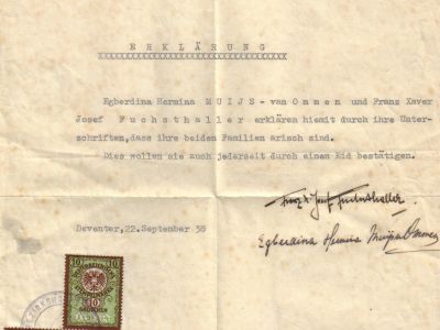 Het huwelijk had nogal wat voeten in aarde. Aangezien Fuchsthaller Oostenrijker was en dat land toen al door de Duitsers bezet was moest er een verklaring komen dat beider families 'rein arisch' zijn. Een periode van onzekerheid brak aan: zonder verklaring geen huwelijk. Uiteindelijk kwam op 22 september 1938 de verlossende verklaring voorzien van de benodigde zegel. De weg voor een huwelijk was vrij. Het aanstaande echtpaar liet er geen gras over groeien en ging de dag daarna in ondertrouw. Op 25 oktober volgde de kerkelijke bevestiging van hun burgerlijk huwelijk (17 oktober 1938) in de N.H. kerk te Diepenveen door dominee Ter Haar. Het echtpaar Fuchsthaller-Van Ommen en hun drie kinderen vestigden zich in Okkenbroek. Via een onderhandse verkoop van Huize Okkenbroek, van de toenmalige bewoner de heer De Wetstein Pfister, werd Fuchsthaller eigenaar van de “Villa”. Daarmee was de publieke verkoop van de “Villa” met 14 slaapkamers die op dinsdag 27 september 1938 in het koffiehuis van Boode te Bathmen zou plaatsvinden van de baan. In de prospectus die gemaakt is voor de verkoop staat onder andere: “Het is één van de mooiste landhuizen uit Nederland, prettig om te wonen in rustige, natuurschone omgeving. Het heeft de gemakken, die men stelt aan een huis in de stad, doch er is de rust van het platteland. Wie van bossen en heide houdt, van wandelingen en fietstochten, van gesprekken met eenvoudige landbouwersbevolking, voor hem is het een ideaal oord.”