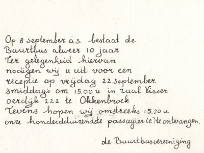 Na tien jaar buurtbus (1989) wordt mevrouw Otten-Van Ens als honderdduizendste passagier in het zonnetje gezet door voorzitter Nijkamp en burgemeester Van den Berg. Zij is een trouwe passagier die regelmatig haar vader Jan van Ens bezoekt in Park Brabant en daarbij de buurtbus als vervoermiddel benut. In zijn toesprak schets Van den Berg het belang van de buurtbus voor de leefbaarheid van Lettele en Okkenbroek. Even dreigt de buurtbus ten onder te gaan aan haar eigen succes. Chauffeurs (m/v) komen en gaan met als gevolg dat er in 1993 meer gaan dan er komen waardoor er een dringend tekort aan chauffeurs ontstaat en dat in een jaar dat er aanzienlijk meer mensen worden vervoerd (12.301) dan in de voorgaande jaren.