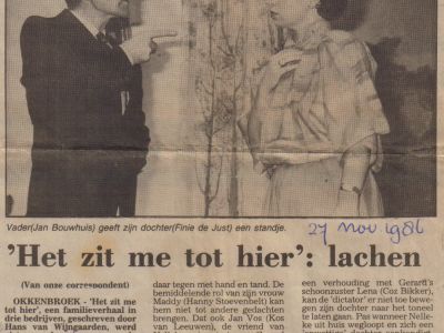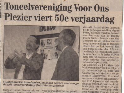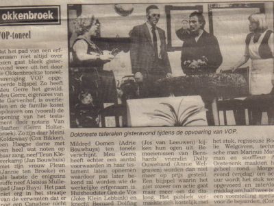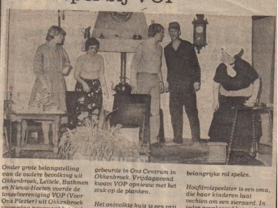 De toneelvereniging VOP (Voor Ons Plezier) is op 3 januari 1948 opgericht. Na vijf jaar oorlog (1940 – 1945), waarin het culturele leven niet bepaald volop bloeide wilde men in Okkenbroek wel eens wat vertier. Mogelijk in de vorm van een jaarlijks toneelstuk. De eerste drie jaar werd een blijspel opgevoerd. De derde uitvoering was ronduit slecht. Een serie treurspelen volgde. Een treurspel, vond men in het algemeen, is eenvoudiger te spelen dan iets vrolijks. Bovendien bleek het grote publiek ernstige spelen, ondanks het feit dat er in de wereld al genoeg ellende is zoals de voorstanders van een blijspel naar voren brachten, wel te waarderen. VOP had niets te klagen over het aantal Okkenbroekers en mensen uit de omgeving die wel eens ‘op de planken’ wilden staan. Al is er een tijd geweest dat het niet mee viel voldoende dames hiervoor te krijgen.