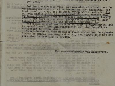 Tiny Otten: "Toen de gemeente Diepenveen begon met het ophalen van het vuil, woonden wij al aan de Okkenbroekerveldweg. Wij werden bij de kern van Okkenbroek ingedeeld. Daar hebben we toen wat van gezegd want in de kern moest je meer betalen terwijl wij buiten de kern vielen maar voor het ophalen van vuil werden we bij de kern ingedeeld. Wij kregen gegalvaniseerde emmers met een deksel en een hengsel.”