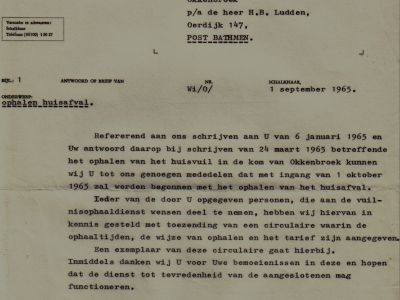 Ongeveer een half jaar later (1 september 1965) ontvangen Okkenbroeks Belang en alle deelnemers aan de huisvuilophaaldienst een brief van de gemeente Diepenveen. Daarin wordt aangegeven dat één maand later zal worden begonnen met het ophalen van het huisvuil in de kom van Okkenbroek. Een circulaire met tarieven en ophaaltijden (afvalwijzer) is bijgesloten. Op vrijdagen, vanaf 09:00 uur, wordt naar volle tevredenheid, het afval opgehaald.
